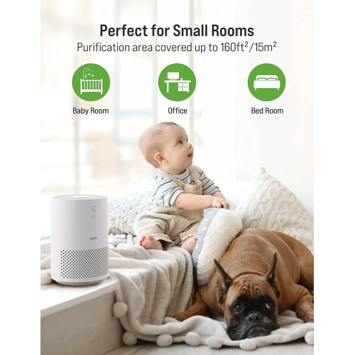 - Small & High Efficiency Air Purifiers for Bedroom : Air Purifier; Light (3.2lb), small(6.3*6.3*9.3 in) but mighty with large purification area covered(up to 160sq.ft). Perfect for quickly cleaning a wide range of contaminants including dust, pet dander, cooking and smoke odors in a certain space