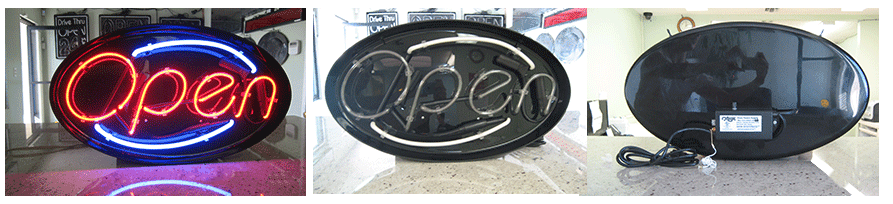 High quality real neon glass. Black transformer has on/off pull chain switch. Screw mounts on top of black plastic box, Neon can be displayed hang on window or on wall. Includes 110 volt UL listed AC adapter, which plugs into any standard household electrical outlet. securely packed in foam. Shipped double boxed and fully insured. 1 year Warranty.