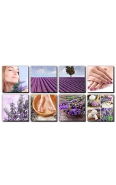 This stunning canvas mural features fresh green and violet images; the eight pieces can be arranged together or separately throughout your space to establish a soothing atmosphere for your clients and encourage them to relax upon entry.