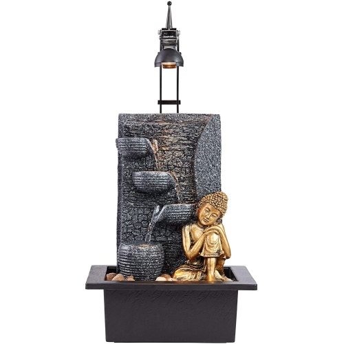 From a covered patio to a sunny spot in a master suite, this energy-efficient LED indoor/outdoor table fountain delivers peaceful and soothing vibes to any space. Crafted in lightweight resin for easy movement, the stone and black fountain features a tiered cascade of water with a gold finish kneeling Buddha perched to one side. An included LED light delivers 200 lumens of light, equivalent to a 20-watt halogen, with a soft white 2700K color temperature.