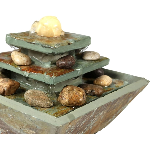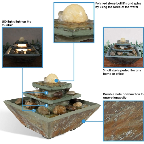 Relax, destress, and unwind with this slate table top fountain. With its warm, earthy colors, and unique ascending tiered style, it's the perfect item to accent and compliment any room in the home. Turn on its built-in LED light to softly illuminate any room while unwinding from a busy day, or simply taking the time to listen to its peaceful trickle of water. Plus, no plumbing is required; simply plug the fountain in once it has been assembled and filled with water.