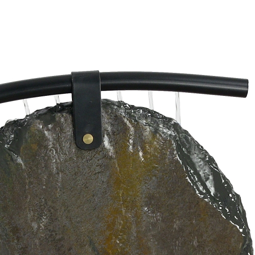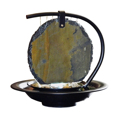 Our newest additional to the Water Wonders tabletop fountain family is the serene and understated Zen Moonshadow. The Moonshadow has been a best seller for decades proving that quality and design never go out of style. The all metal construction is finished with a durable black satin finish. A genuine slate stone hangs gracefully from a softly curved arm over a bed of illuminated pebbles. This is a beautiful gift to give or receive.