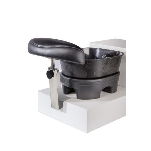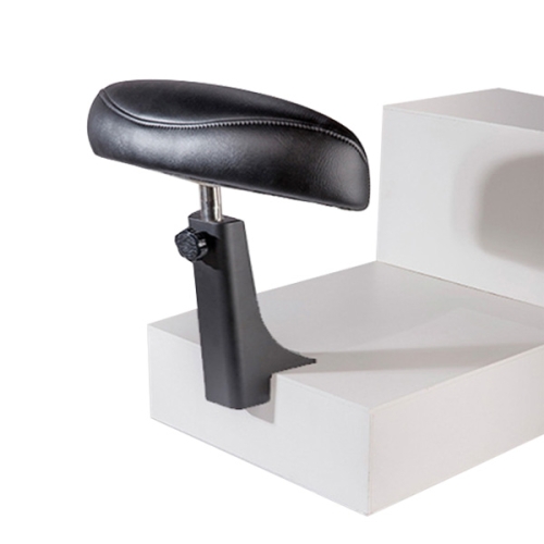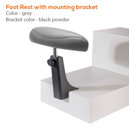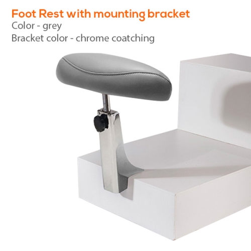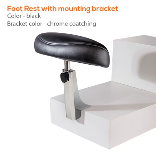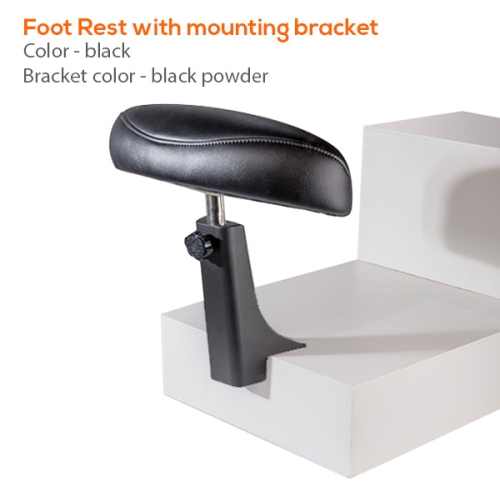 Adjustable Pedicure Foot Rest with Mounting Bracket in Black Powder Coat and Custom Color Upholstery, perfect for custom built pedicure benches, booths, and thrones. Whether you have an existing system or are starting from scratch, our adjustable footrest is a great addition to any pedicure set-up with a flat surface. With easy installation requiring only 4 screws, it is universal and can be used with any system you have.