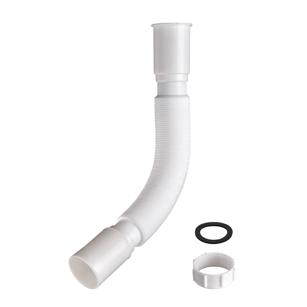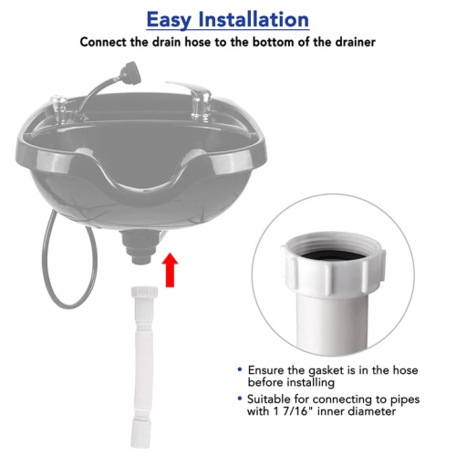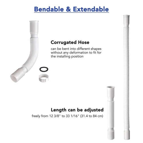 Drain hose kit includes 1 drain hose, 1 lock nut and 1 plastic gasket and it is designed for renewing your old and broken drain hose of shampoo bowl. It features flexible corrugated design and extendable length from 12 3/8" to 33 1/16" for fitting your installing location perfectly.